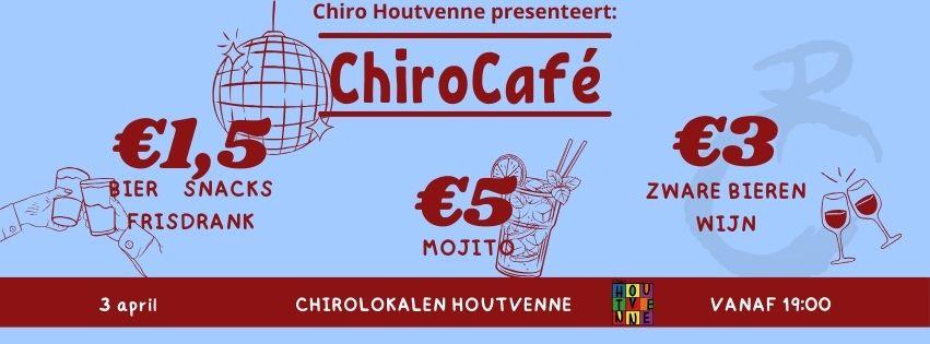 19March ChiroCafé evenement Het is weer zover! Vrijdag 3 april is het ChiroCafé!Twijfel niet en kom gezellig iets drinken!Zoals altijd zal alles aan zeer schappelijke prij...